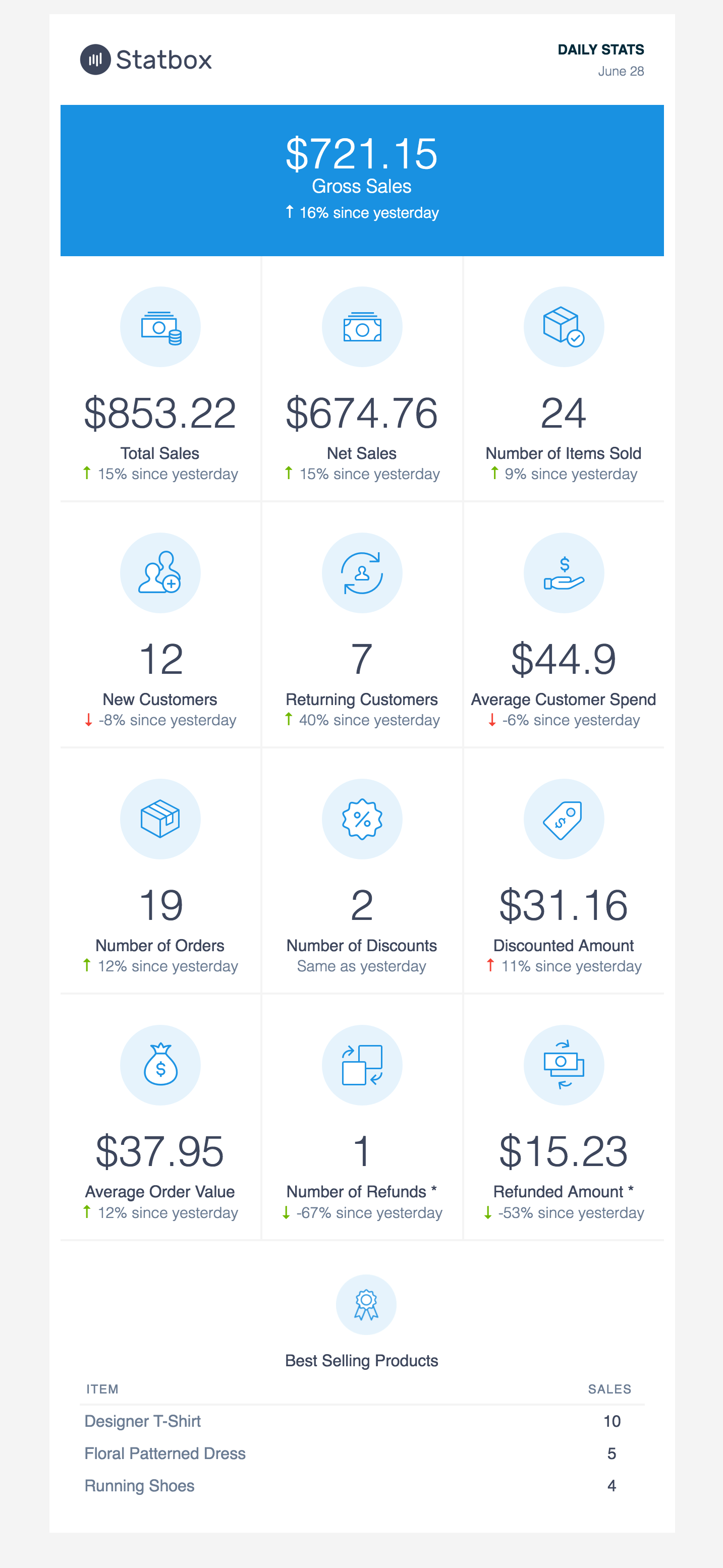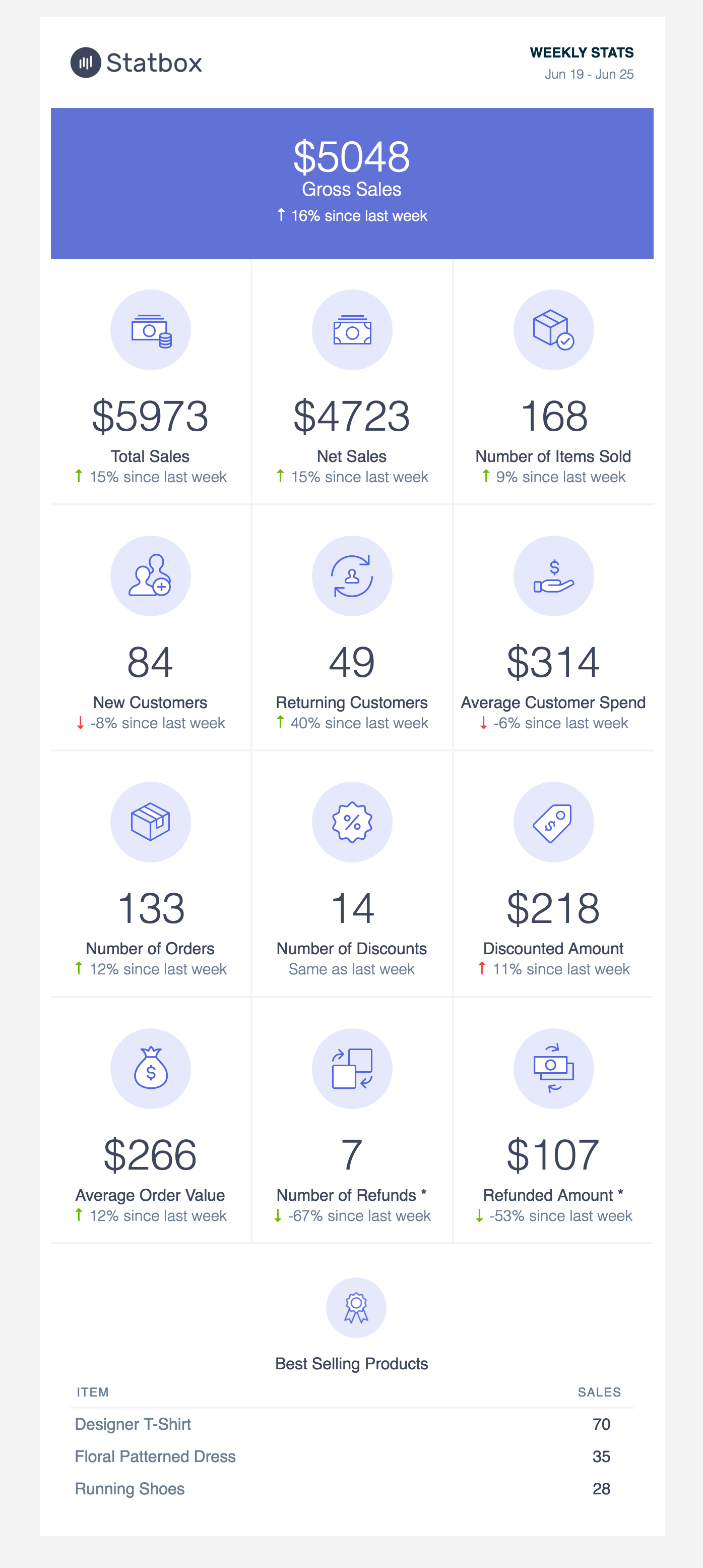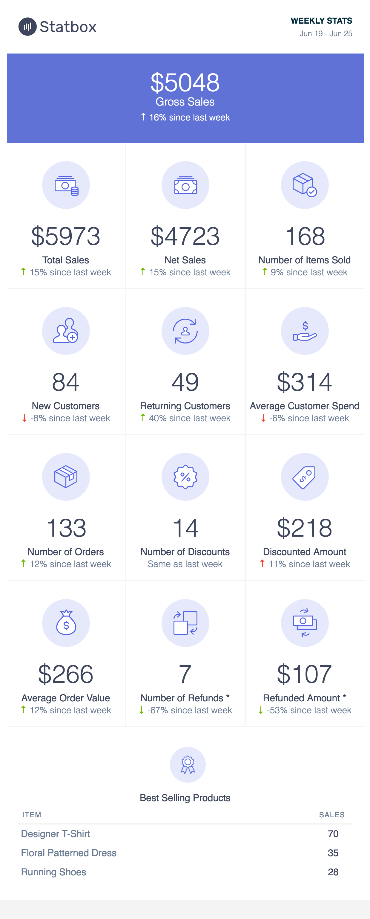You don't always have the time to check how your store is performing. Statbox provides daily, weekly and monthly sales performance reports directly to your email!
